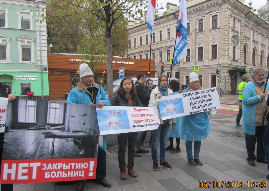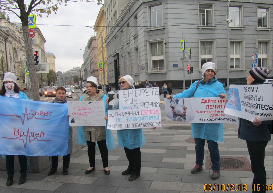 6 октября 2018 года перед Минздравом прошел пикет, организованный профсоюзом «Действие», "Лигой защиты врачей" и профсоюзом «Альянс врачей». Его участники, врачи и пришедшие их поддержать пациенты, развернули плакаты: