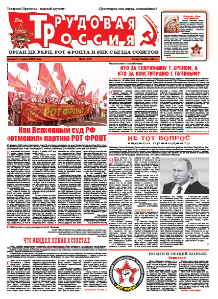 «Как Верховный суд РФ «отменил» партию РОТ ФРОНТ» сообщает пресс-центр ЦК РОТ ФРОНТа в 5-м номере «Трудовой России». По иску Минюста РФ Верховный суд решил ликвидировать партию трудящихся. Но дело, за которое борется РОТ ФРОНТ, никакими бумажными запретами никто отменить не может, и оно будет продолжено.