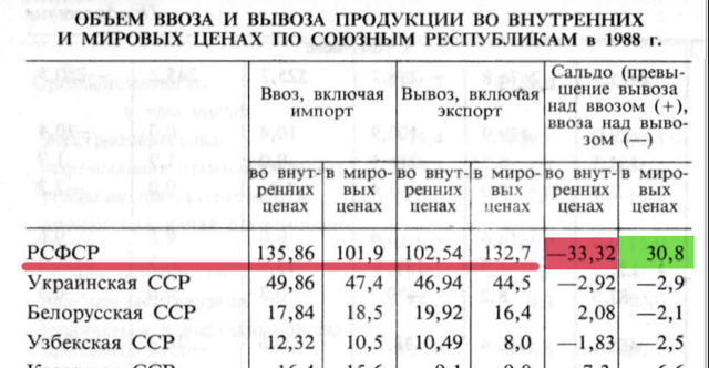 Из таблицы понятно, что если считать внутреннюю торговлю в рублях и по внутренним ценам, то получается, что баланс оказывается отрицательным для РСФСР. Т.е. это республики кормили РСФСР, а не РСФСР кормил республики. Если же переводить торговлю в бездуховные доллары и в мировые цены, то картина меняется на противоположную.