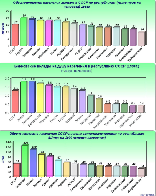 Полезно также взглянуть на такие близкие и понятные людям параметры, как, например, средняя зарплата на душу населения в каждой из республик СССР. Или на такие материальные блага, как банковские вклады, наличие в личной собственности легкового авто, кв. метров жилья и т.д: